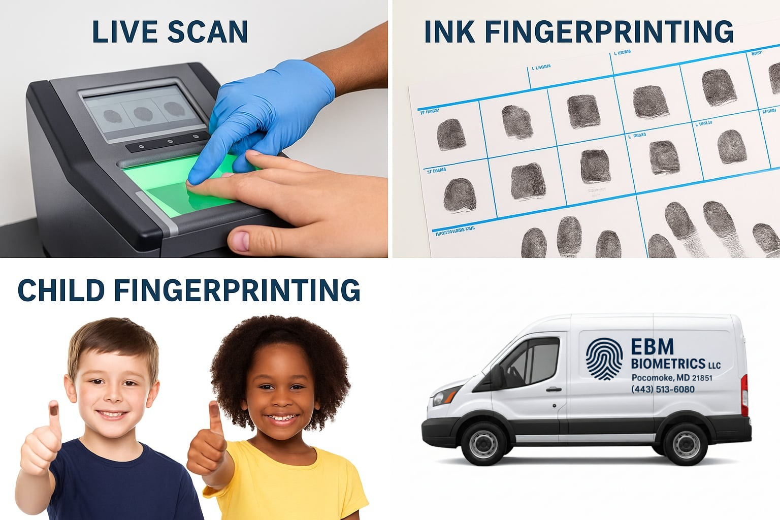 Welcome to EBM Biometrics LLC, your trusted fingerprinting service on the Eastern Shore. We provide fast, accurate, and convenient fingerprinting services for individuals, families, and businesses. Whether you need Live Scan, Ink Card, or Child Safety ID fingerprinting, we’re here to make the process easy and professional. Fully Licensed and insured for your protection.